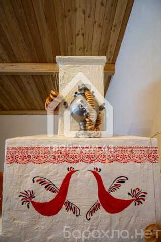 В коттедже: уютная кухня-гостиная в русском народном стиле с печью-диваном, санузел, 3 спальни.